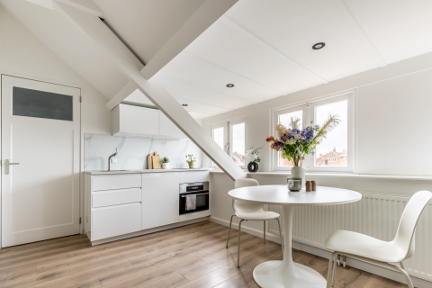 1e verdieping: ruime woonkamer met hoge plafonds (ca. 3m) en veel raampartijen, ruime keuken met toegang tot het zonnige dakterras op het zuiden, moderne badkamer met douche, wastafelmeubel, toilet en wasmachine/droger aansluitingen.